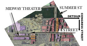 15 Channel Center Street is a short walk from the red line at either South Station or the Broadway Station. Estimated walking time from South Station: 13 minutes: Walk or drive over Summer Street bridge, towards South Boston away from financial district. After one block you will cross the Summer Street bridge over the Fort Point Channel. Take 1st right onto Melcher Street. At end of Melcher (2 blocks) make right onto A Street. Continue three blocks down A Street, past parking lot, Wormwood Street and 249 A Street. Just after 249 A Street, make a left on Binford Street, first right on Channel Center Street -- walk halfway down this block to Midway Theater on the left. |